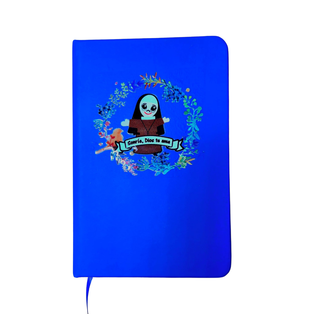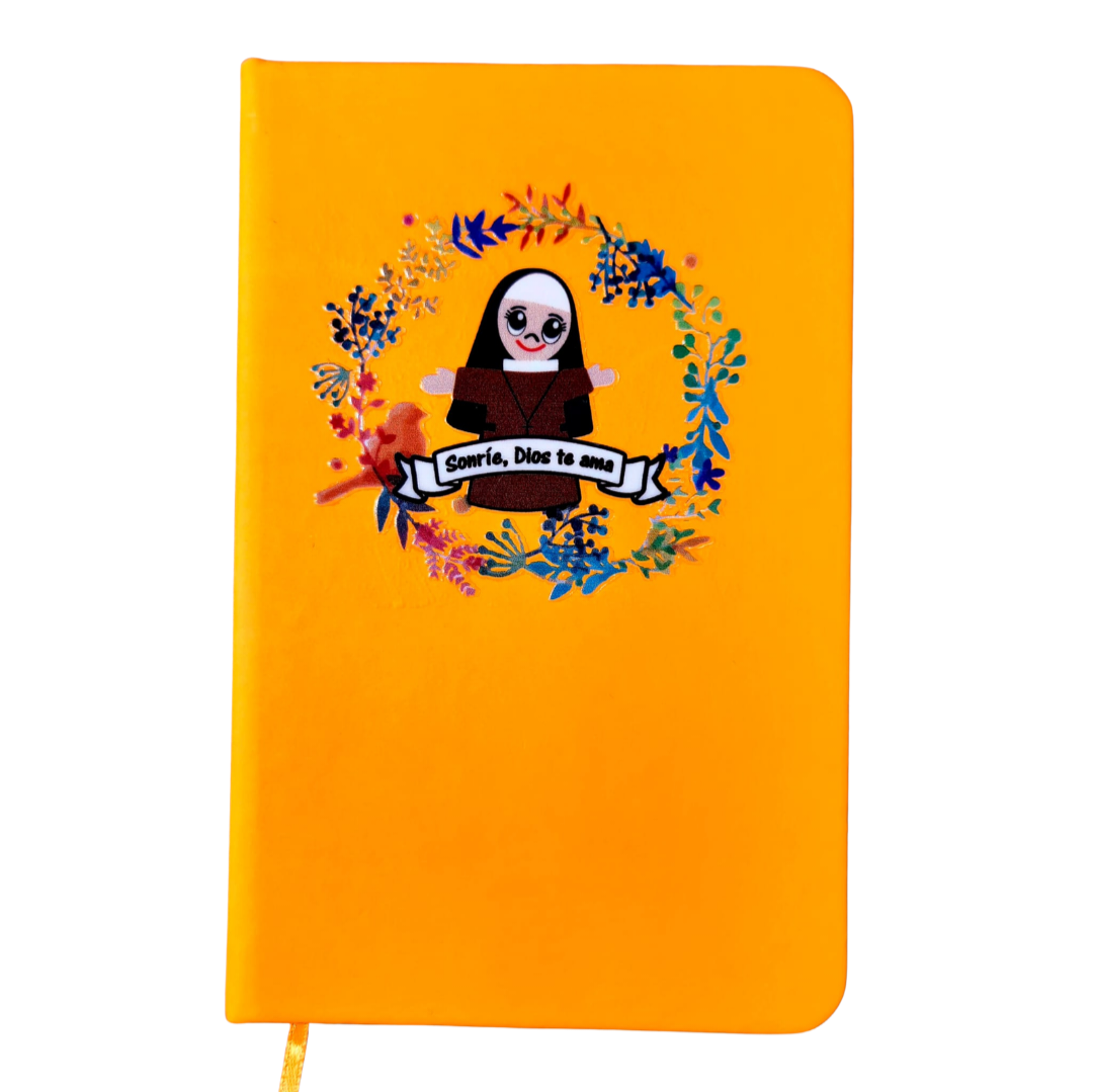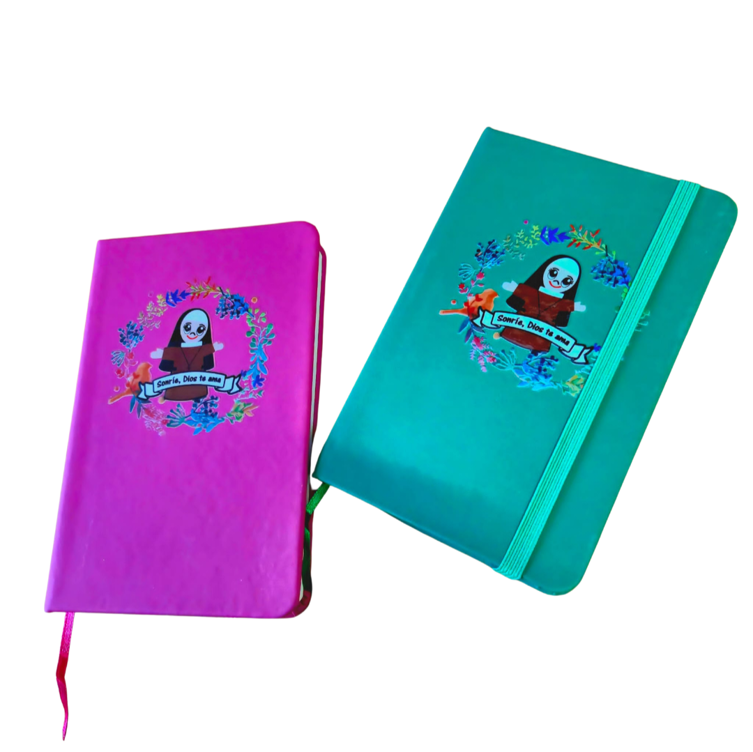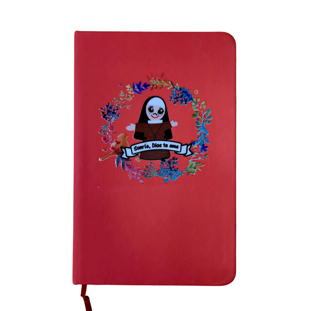 Cuaderno de notas Monjita Samaritana con tapa rígida de polipiel. Marcapáginas y banda elástica. 100 hojas.