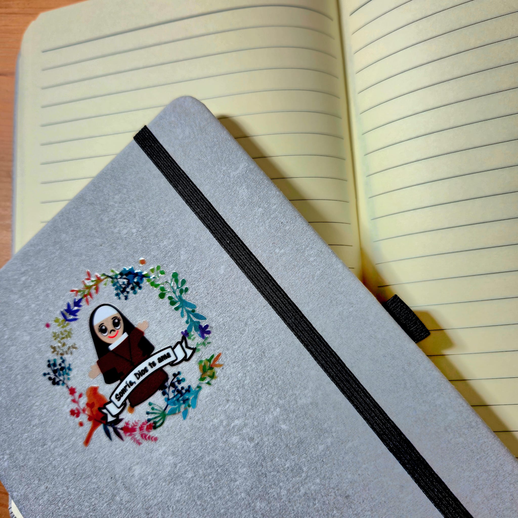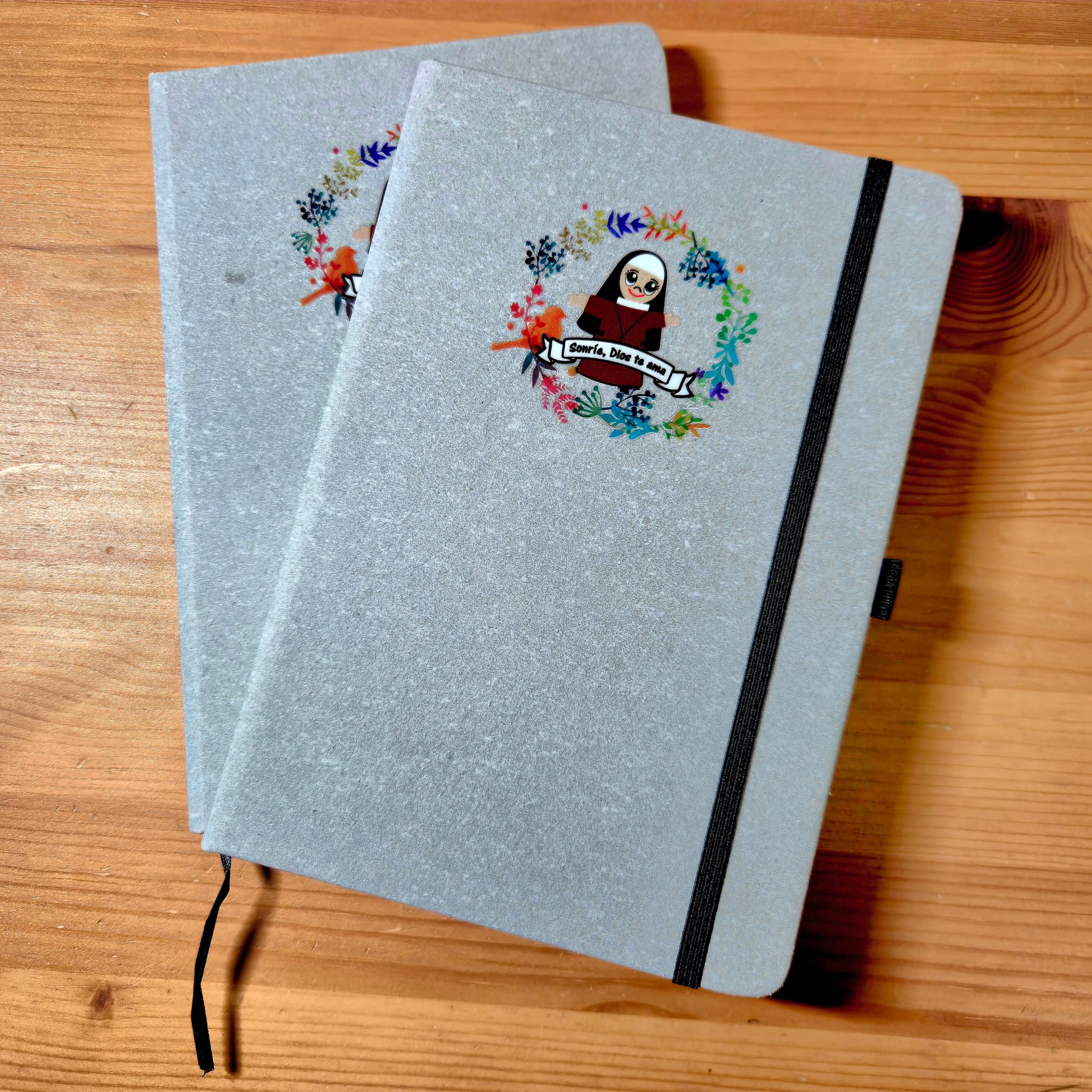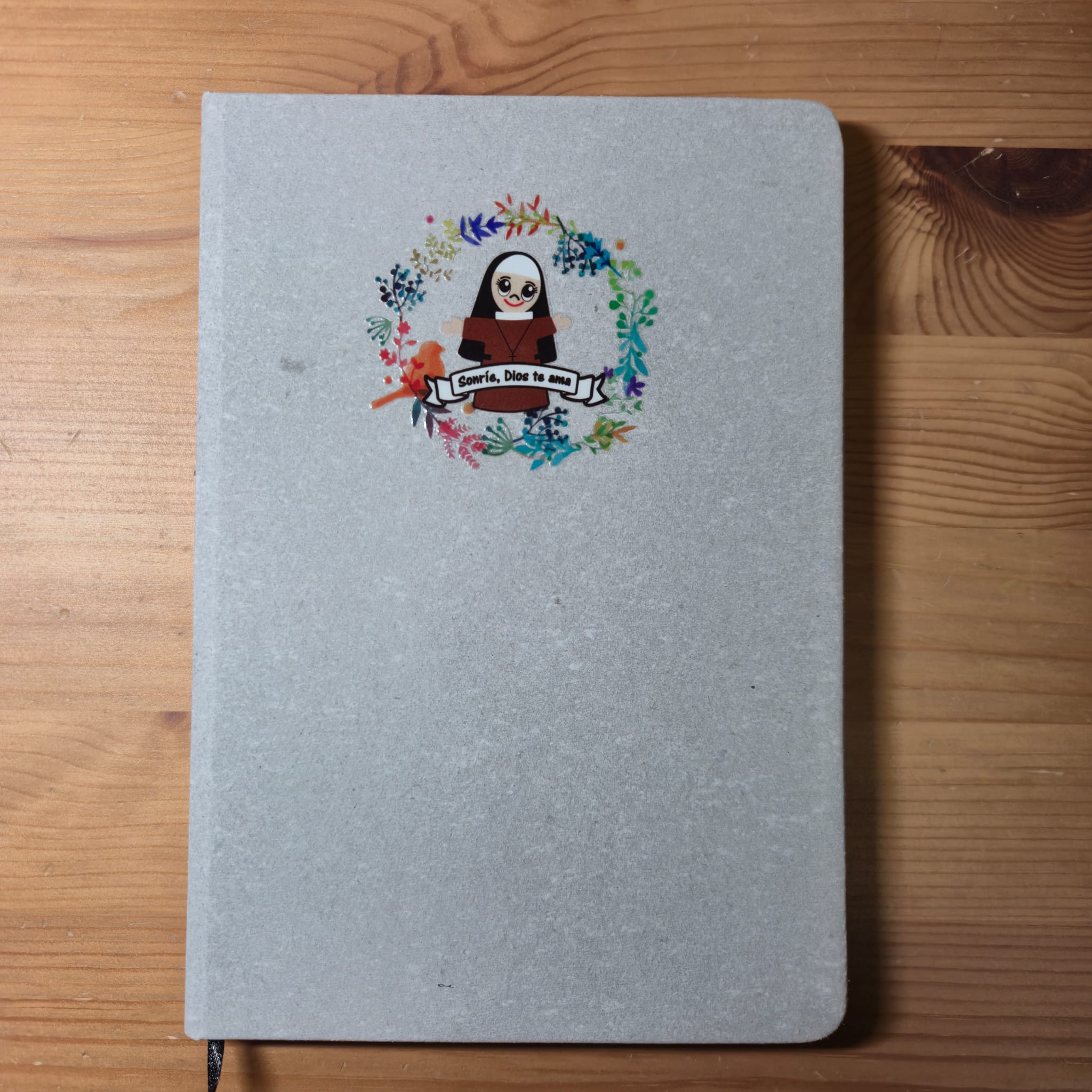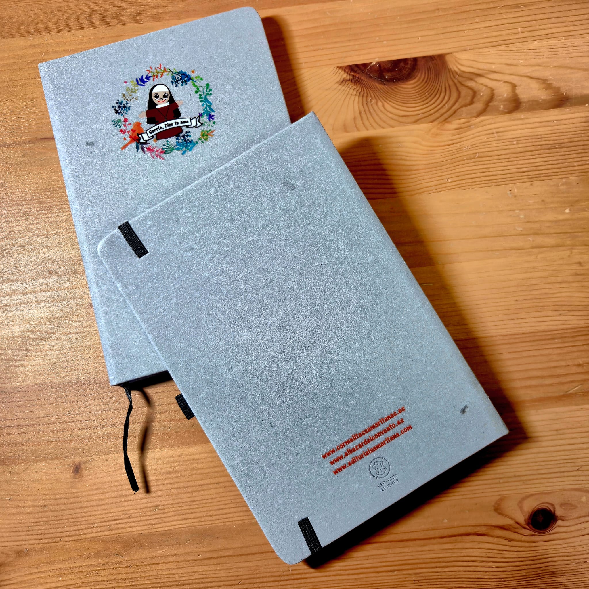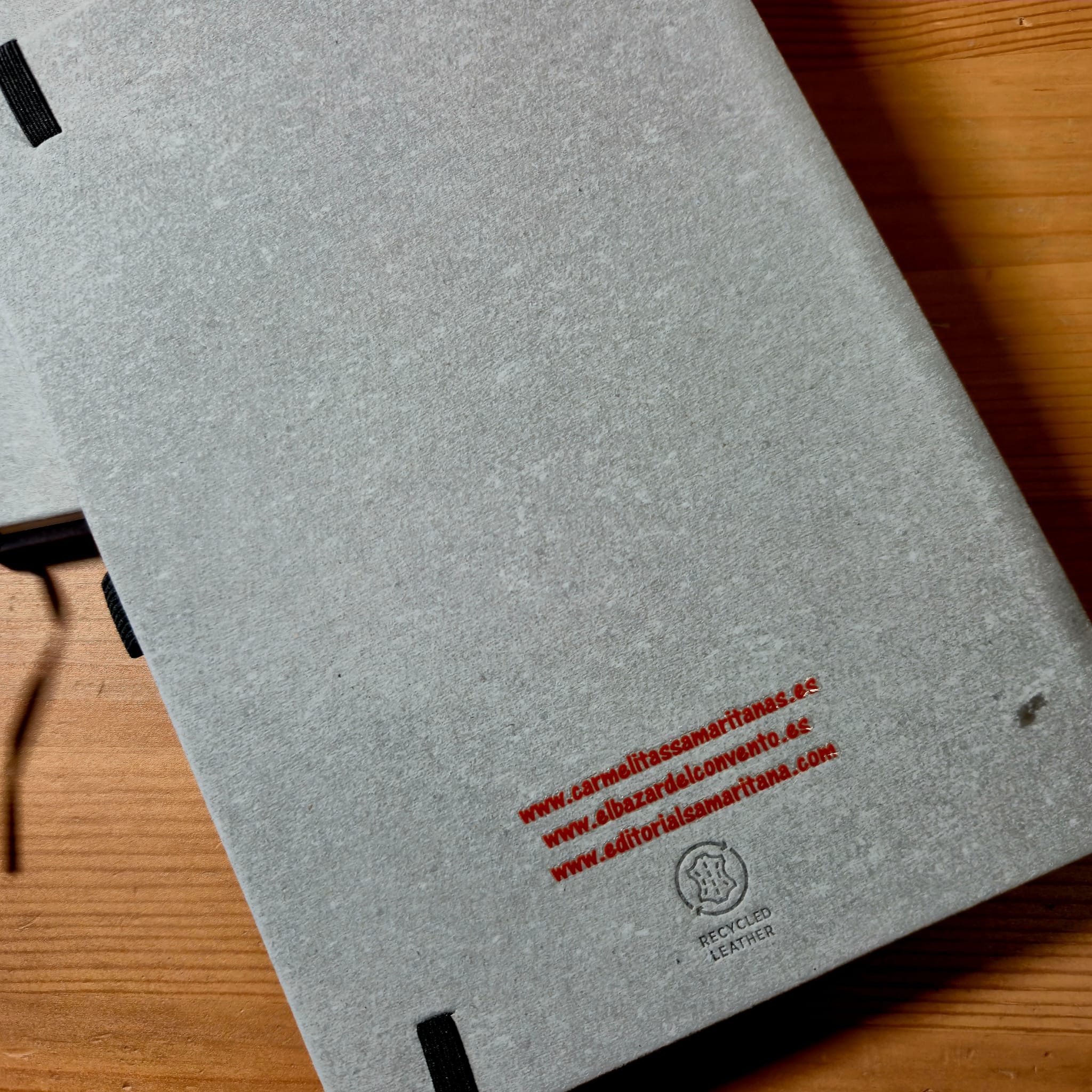 Cuaderno de notas Monjita Samaritana con tapa rígida de piel reciclada. Marcapáginas y banda elástica. 100 hojas de papel color hueso a una linea Disponible en color gris y en A5 (14 x 21 cm)