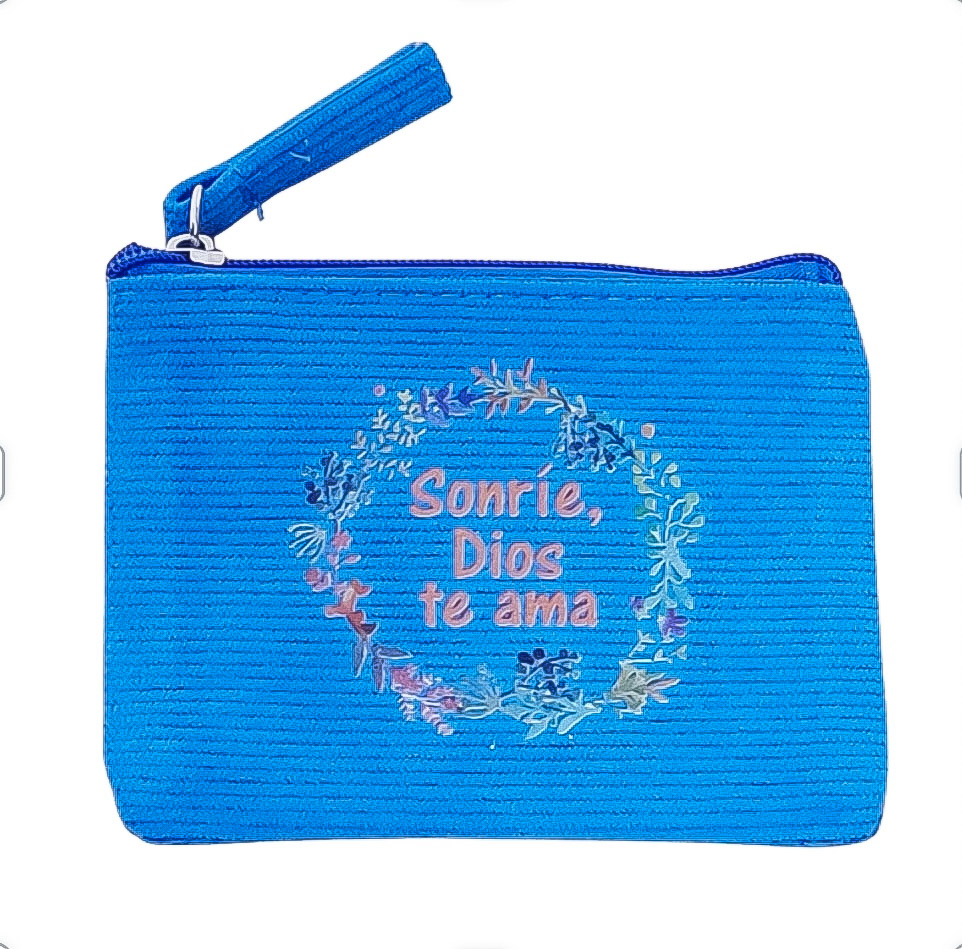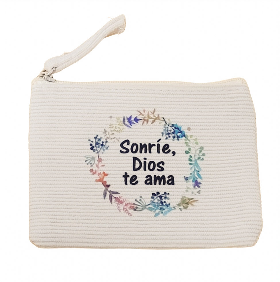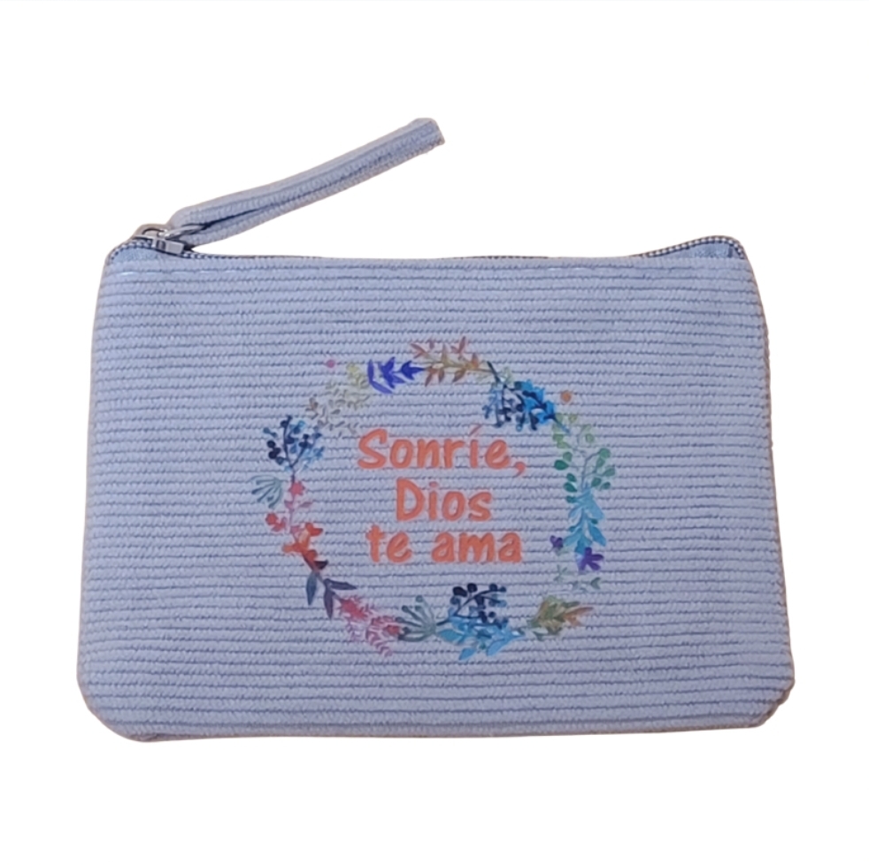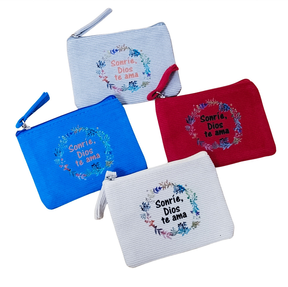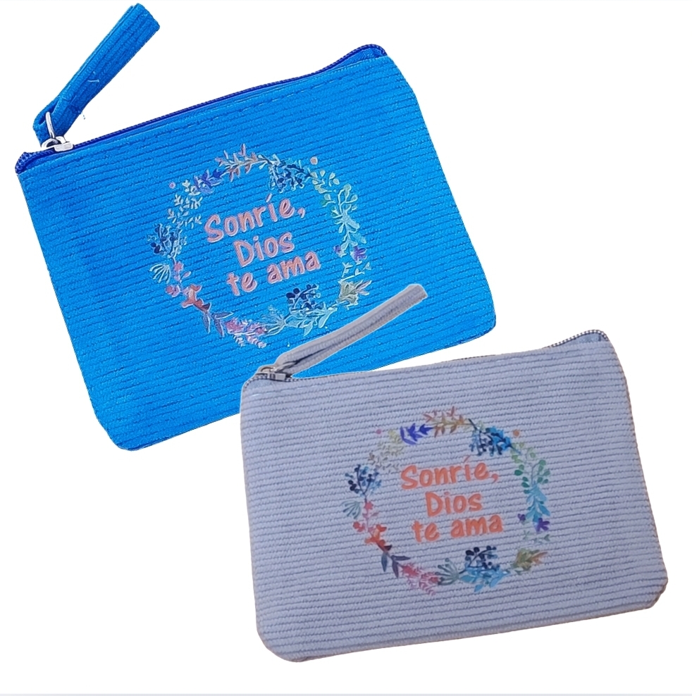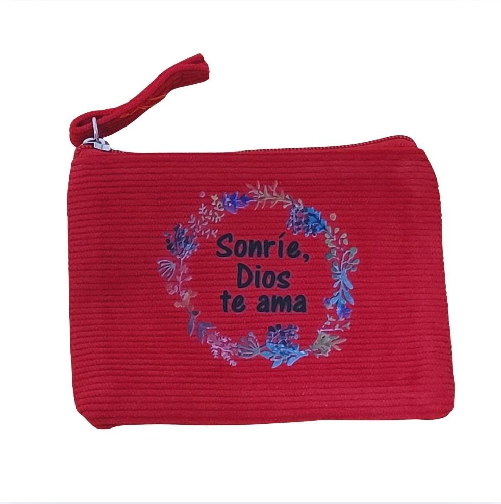 Monedero «Sonríe Dios te ama» realizado en tejido de pana con cierre de cremallera y tirador a juego.