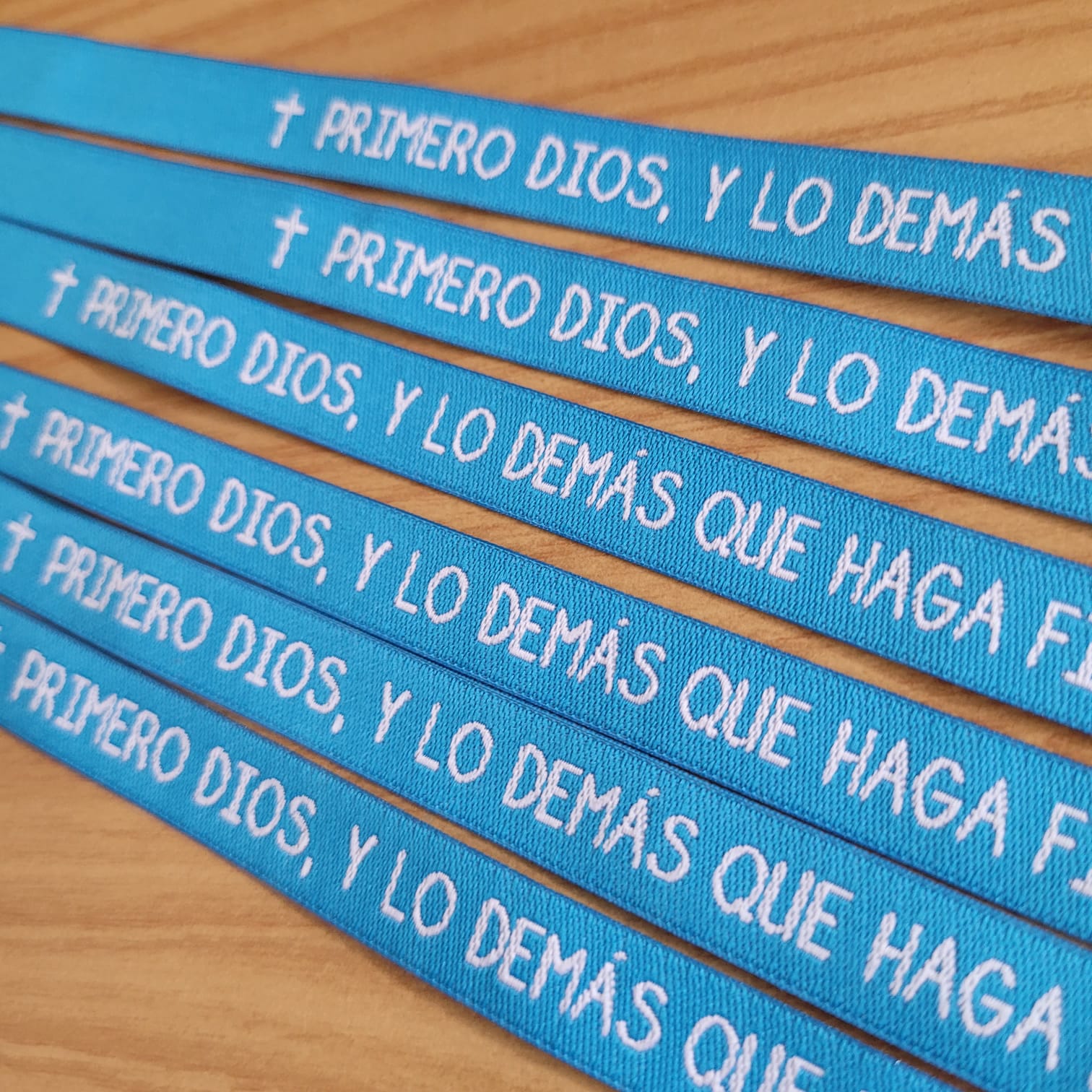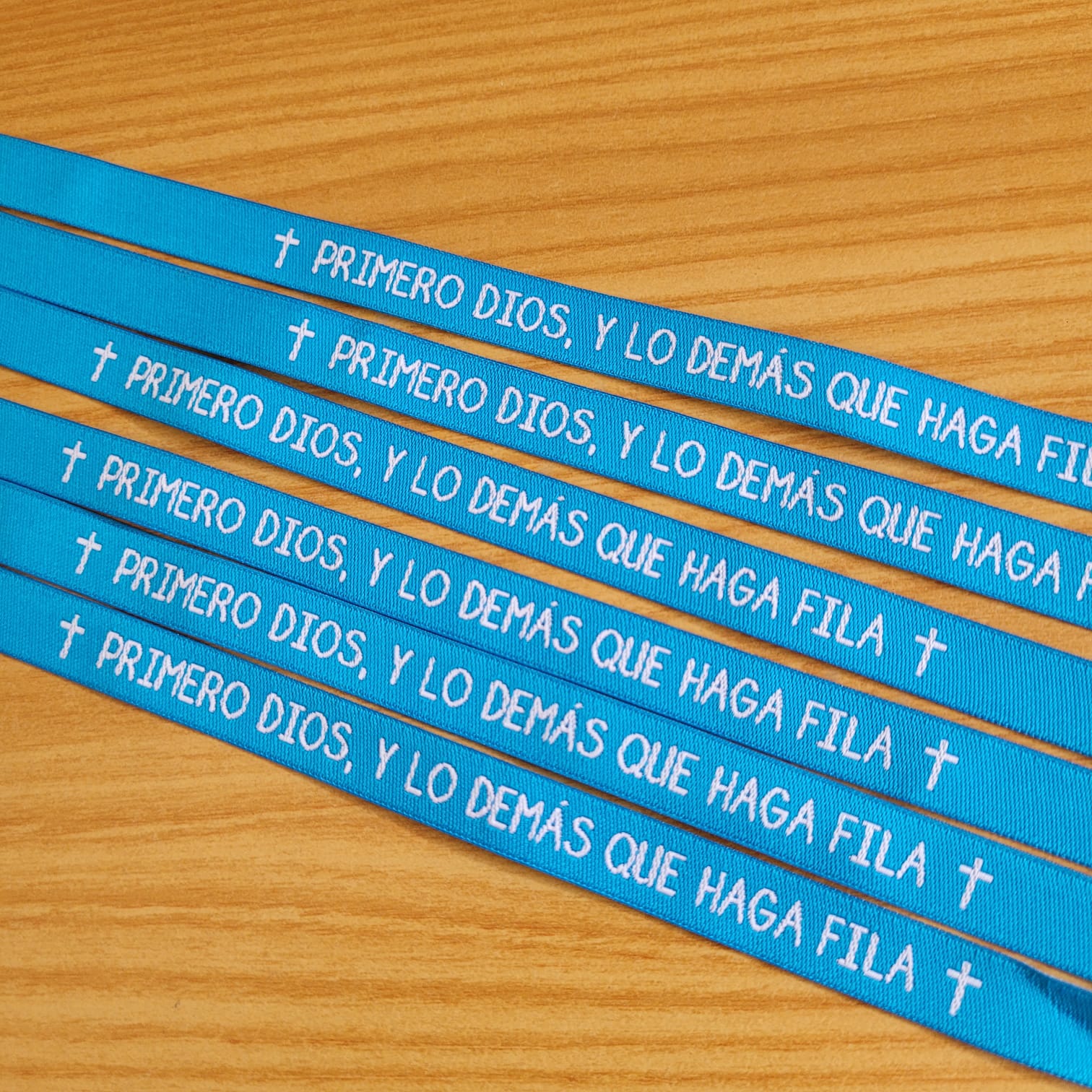 Pulsera de tela de color azul con frase: «Primero Dios y lo demás que haga fila».